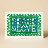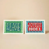 A pack of ten Christmas cards and envelopes. The pack contains two designs, five ‘Peace & Love’ and five ‘Joyeux Noel’.