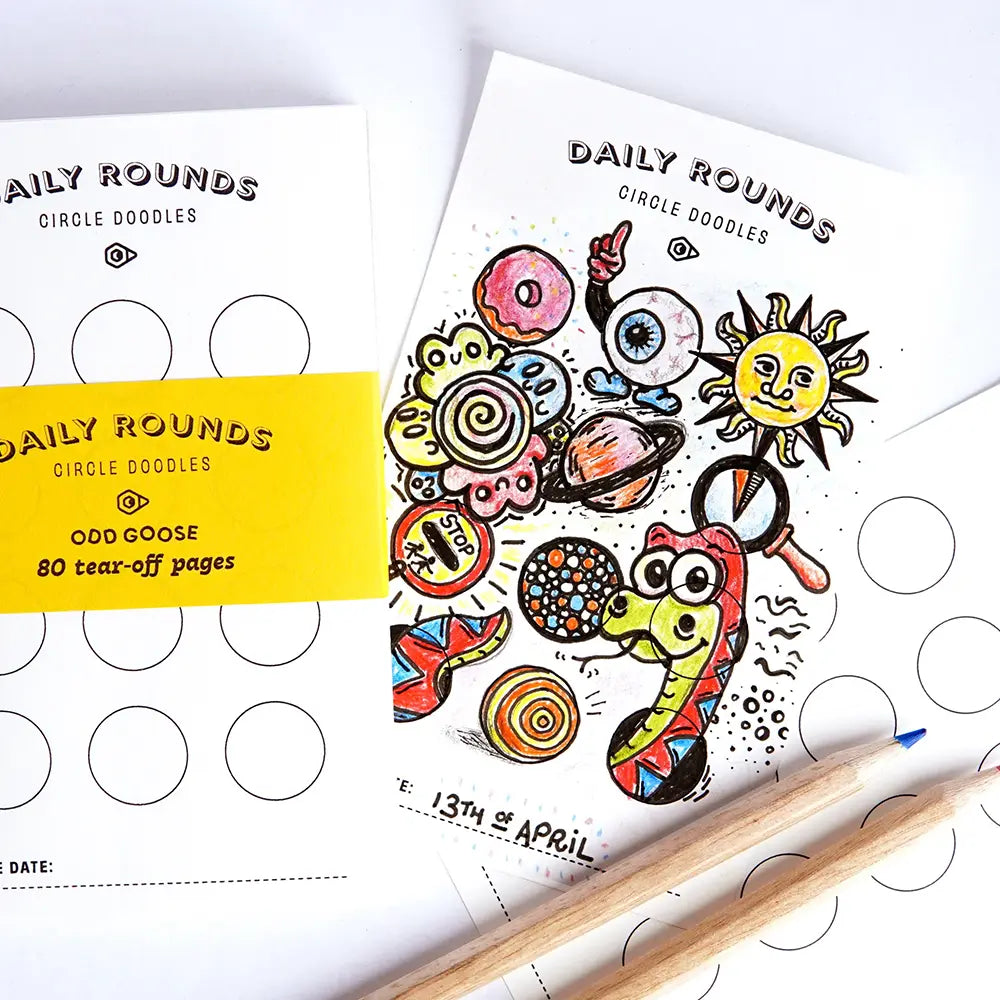 Nine circles, endless possibilities! Put your creative doodling to the test with the Daily Rounds notepad. This perfect desk or countertop pad has eighty tear-off pages and is ready whenever you feel like doodling. And each sheet is the perfect size for sticking your masterpieces on the fridge, gluing into your notebook, or using as a bookmark!