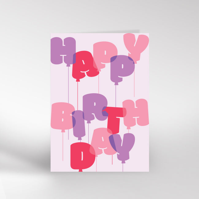 Pink Birthday Balloons card by Dicky Bird, beautifully printed on a heavy matte paper stock with a brown Kraft envelope.